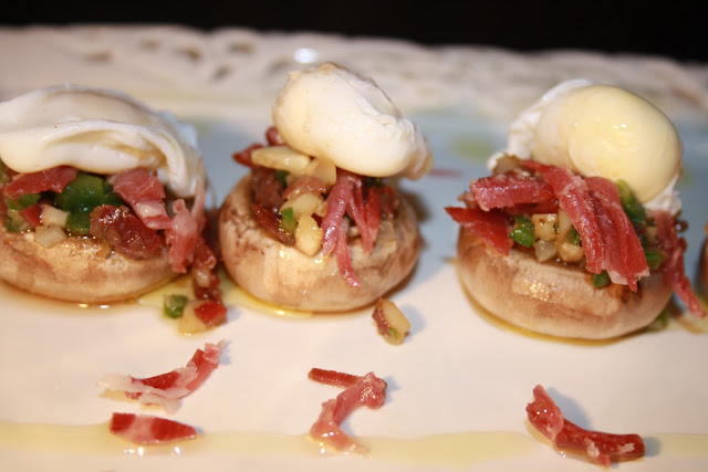 Echar en un cazo con agua hirviendo el huevo durante unos segundos, sacar y decorar sobre el champiñón.
